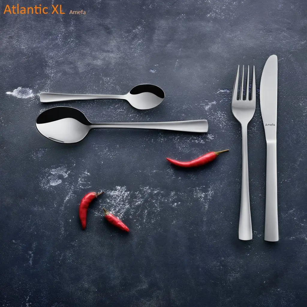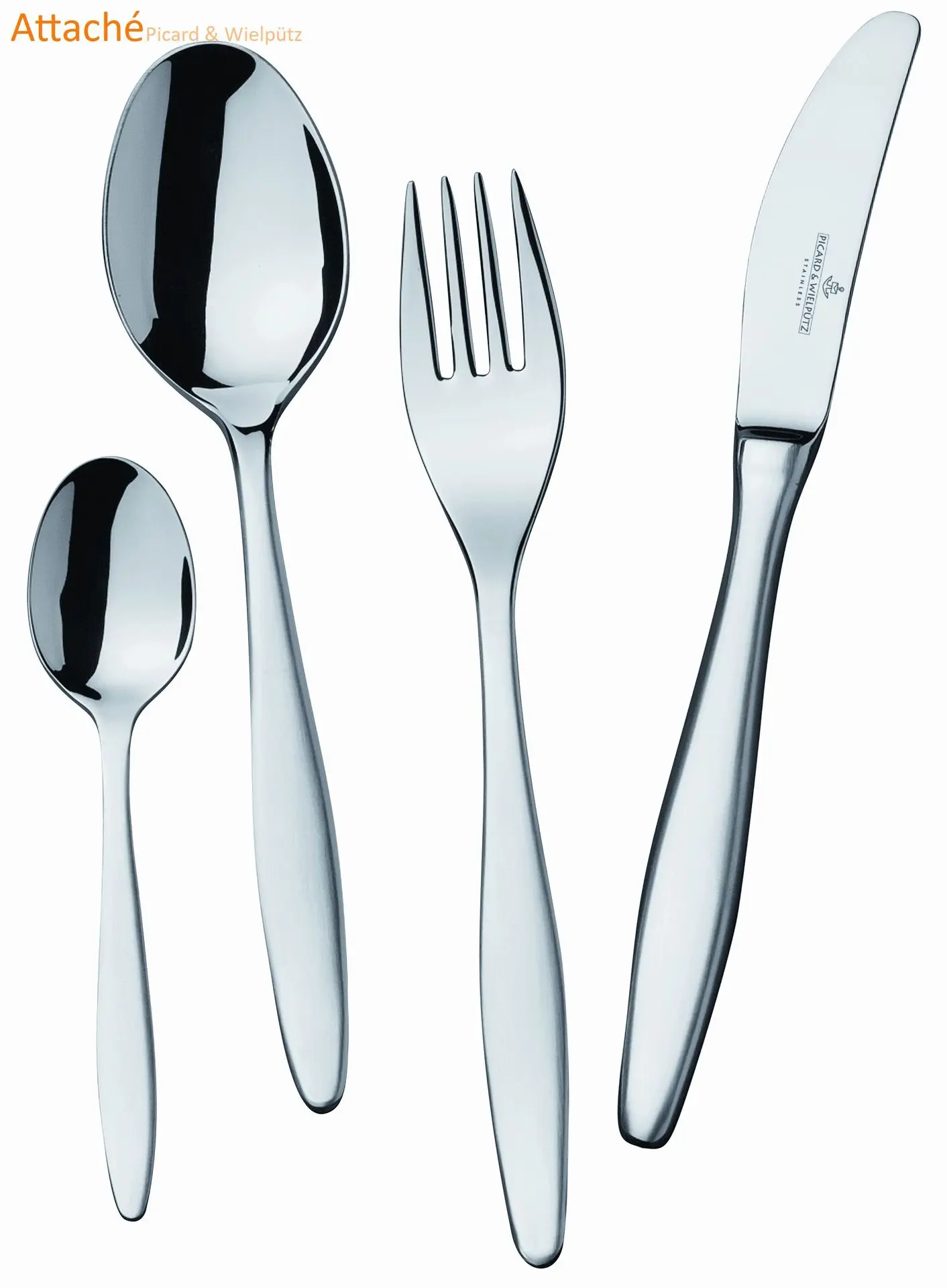 Die Besteck Serie ATTACHÉ kommt mit weichen, geschwungenen Rundungen daher. Sie wird aus 2,5 mm 18/10 Chromnickelstahl gefertigt, oder alternativ auch aus 18/0 Chromstahl. Letzteres verleiht dem Besteck einen Magnetismus, welcher zum Beispiel für die magnetische Bandabnahme von Besteck in großen Kantinen benötigt wird.