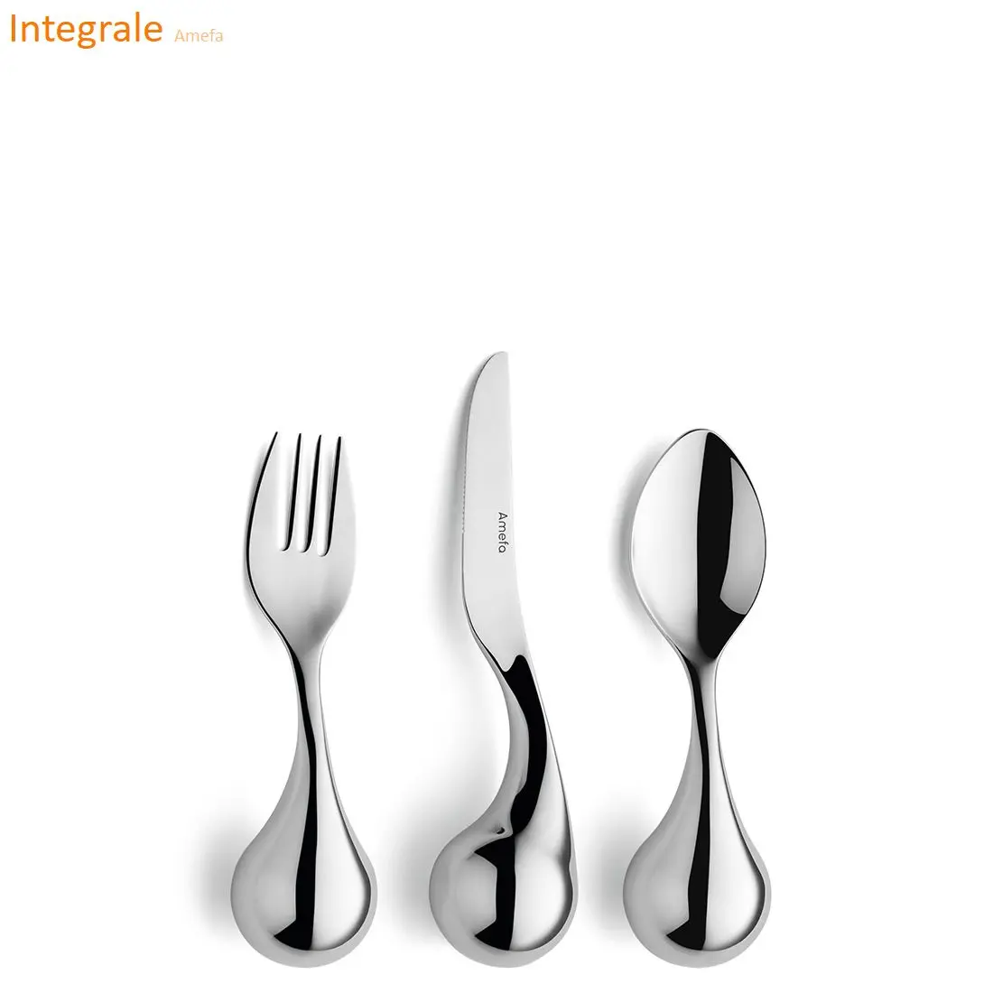 Die Gabelfläche ist stark gewölbt und der Löffel besonders tief ausgeformt, damit aufgenommene Speisen nicht so leicht runterfallen.