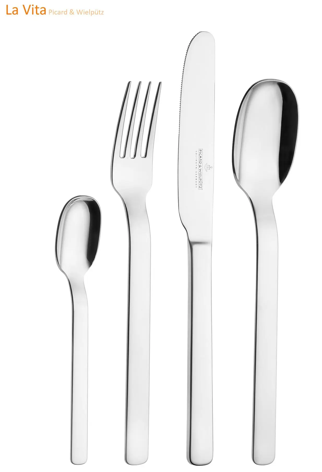 Das Besteck LAVITA überzeugt durch klare, gerade Linien und passt perfekt in ein modernes Ambiente. LAVITA wird aus hochwertigem 18/10 Chromnickelstahl, mit Ausnahme der Massivmesser, in Solingen produziert und kommt mit einer soliden Materialstärke von 3,5 mm daher.